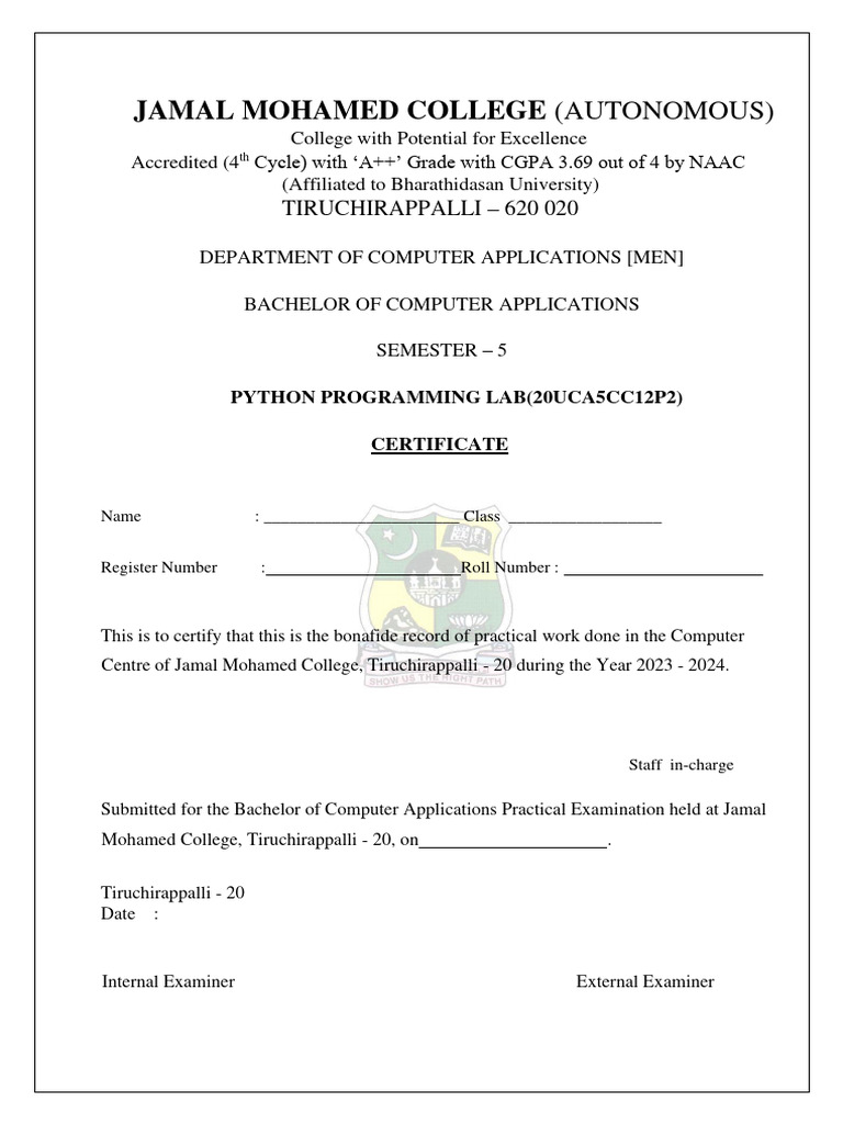 Submitted for the Bachelor of Computer Applications Practical Examination held at Jamal
