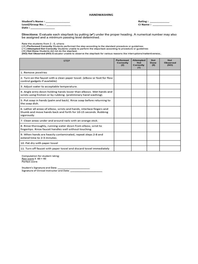 Directions: Evaluate each step/task by putting (✔) under the proper heading. A numerical number may also