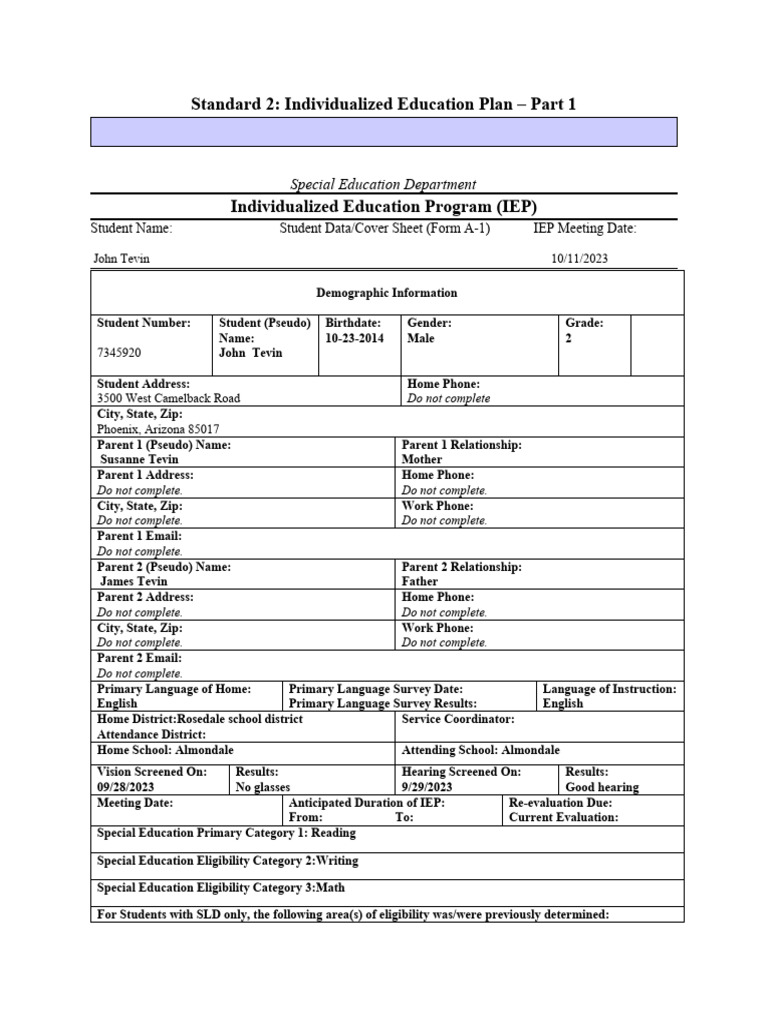 Student (Pseudo) Name: John Student Data/Cover Sheet (Form B) IEP Meeting Date: