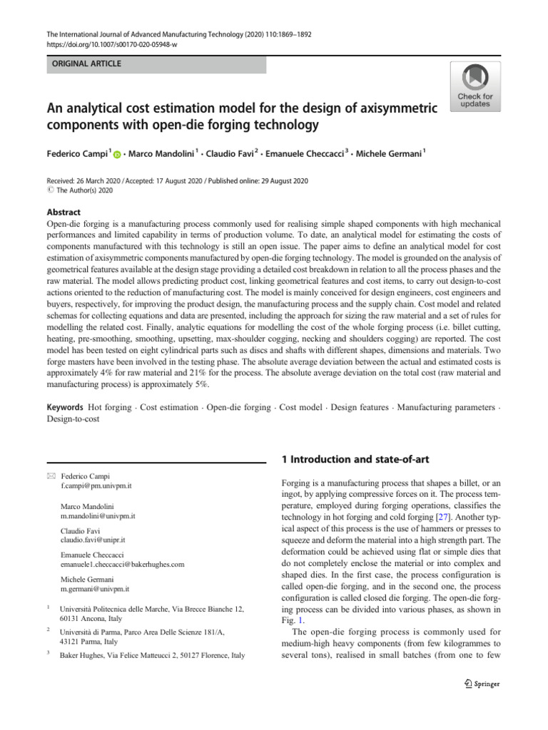 forgings. Int J Adv Manuf Technol 103:3057–3065. https://doi.org/ 45. Xu X, Fang S, Gu X (2006) A model for manufacturing cost esti-
