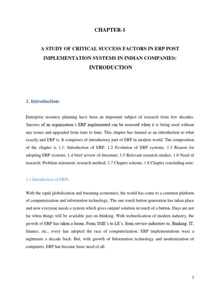 adopting ERP systems; 1.4 brief review of literature; 1.5 Relevant research studies; 1.6 Need of