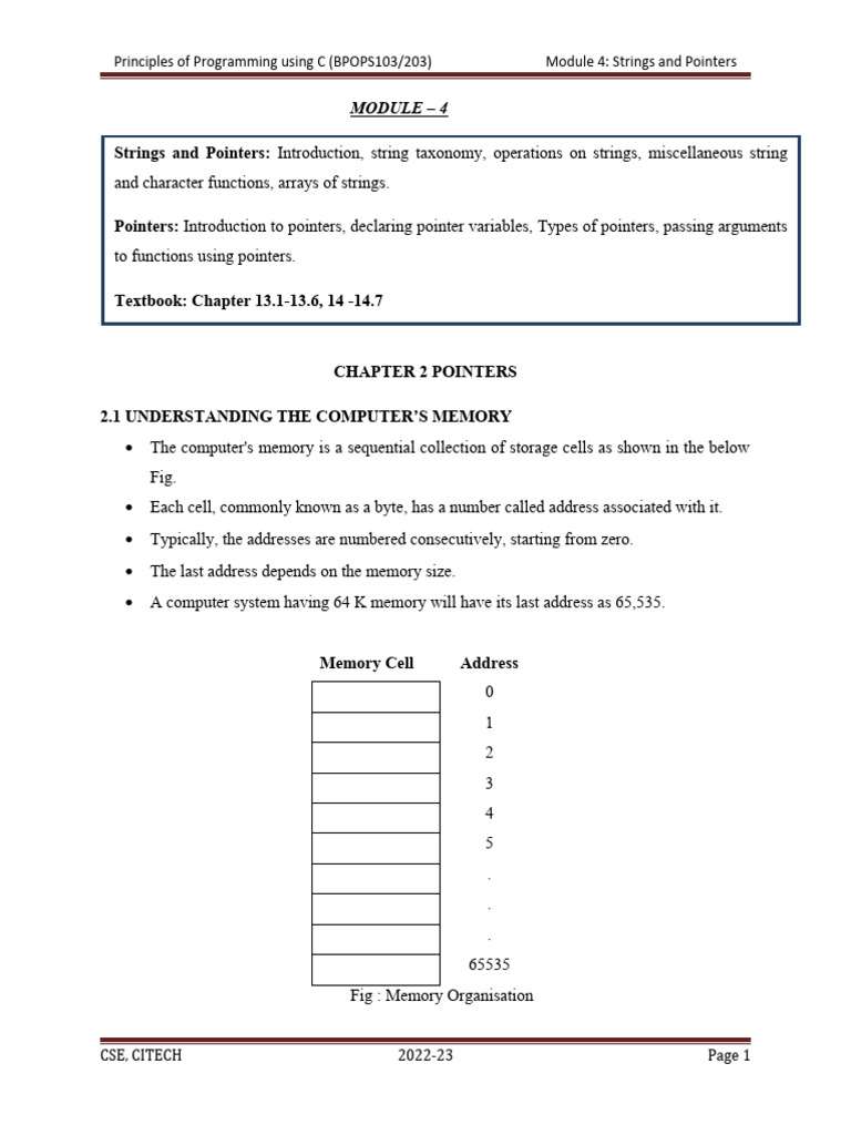 Principles of Programming using C (BPOPS103/203) Module 4: Strings and Pointers
