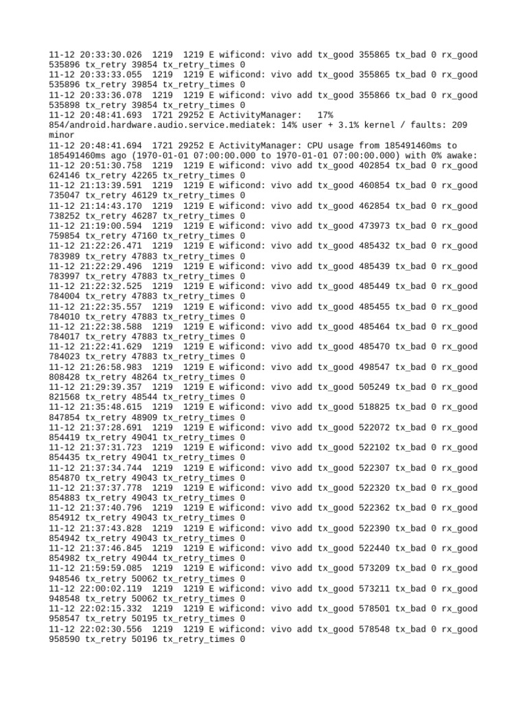 11-12 22:00:02.119 1219 1219 E wificond: vivo add tx_good 573211 tx_bad 0 rx_good