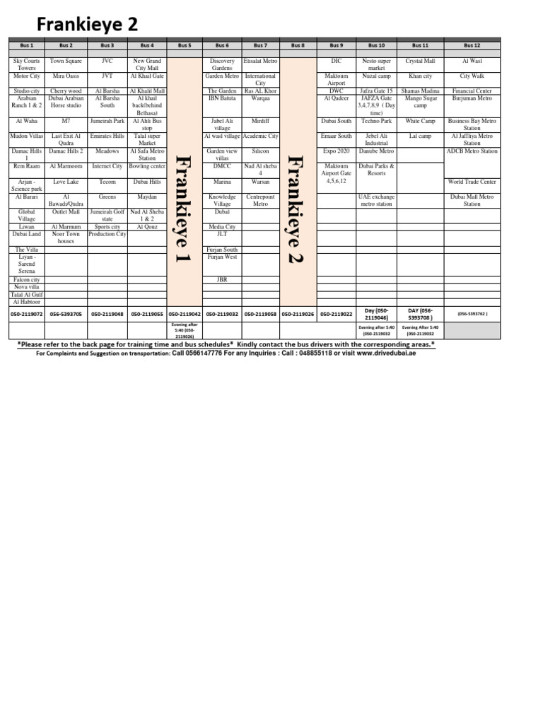 *Please refer to the back page for training time and bus schedules* Kindly contact the bus drivers with the corresponding areas.*