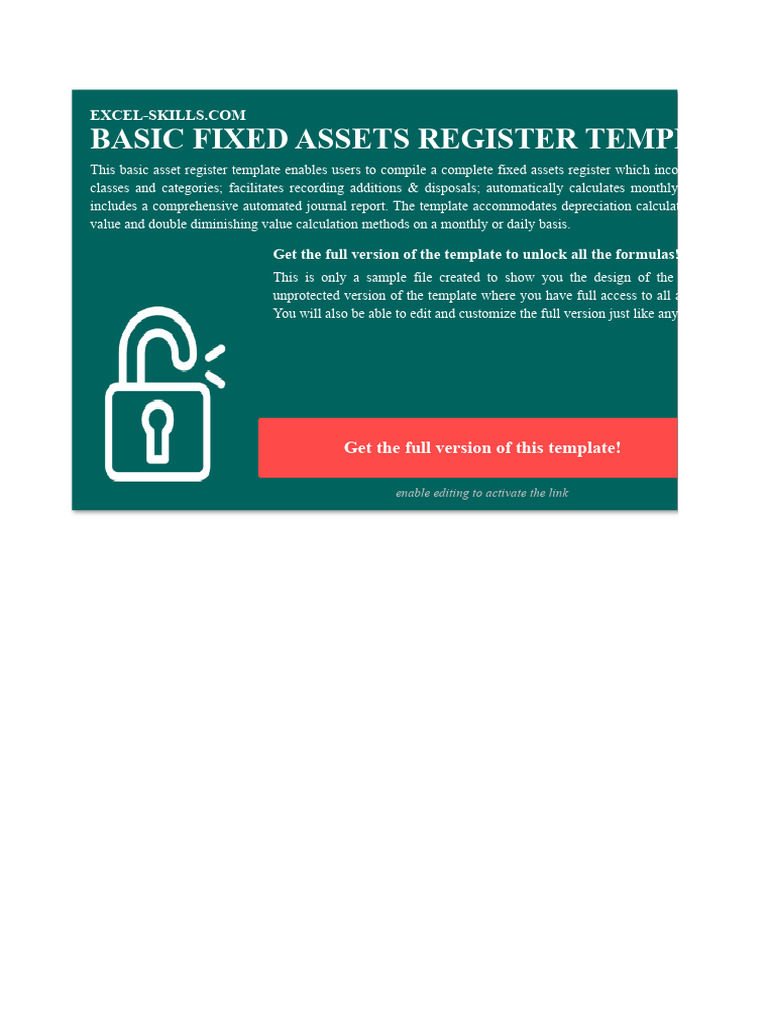 This basic asset register template enables users to compile a complete fixed assets register which incorporates an unli