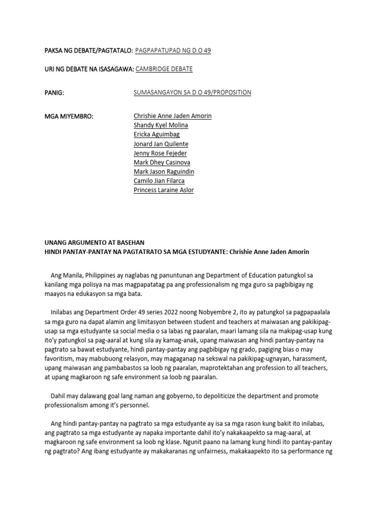PAKSA NG DEBATE/PAGTATALO: PAGPAPATUPAD NG D.
