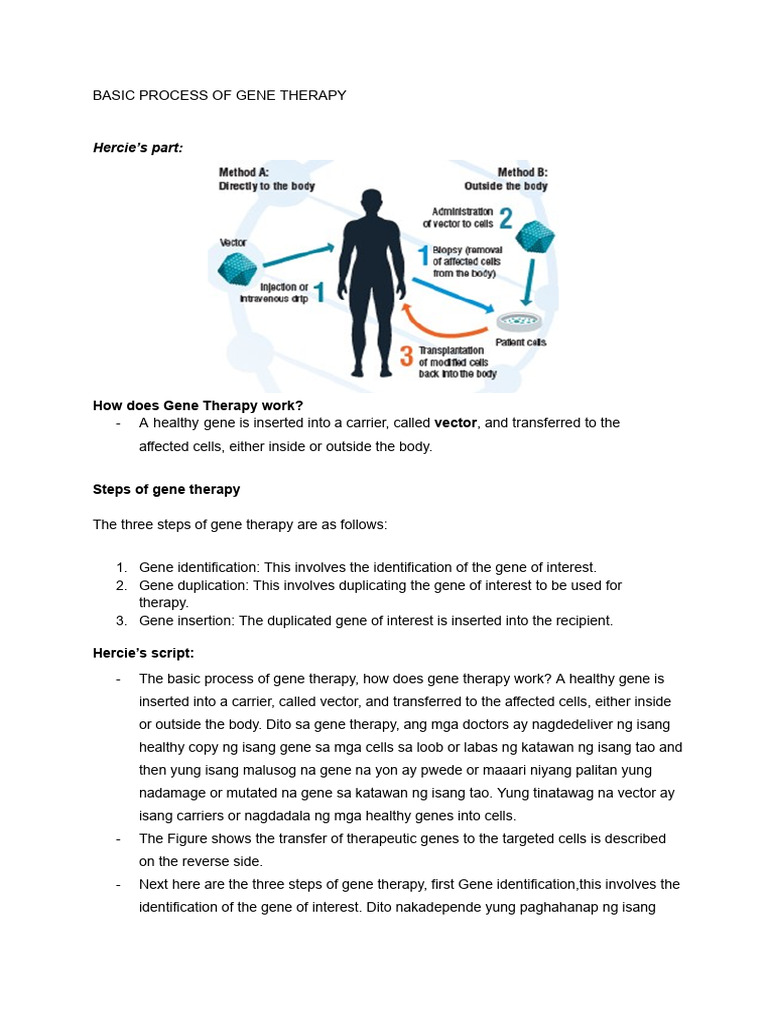 or outside the body. Dito sa gene therapy, ang mga doctors ay nagdedeliver ng isang