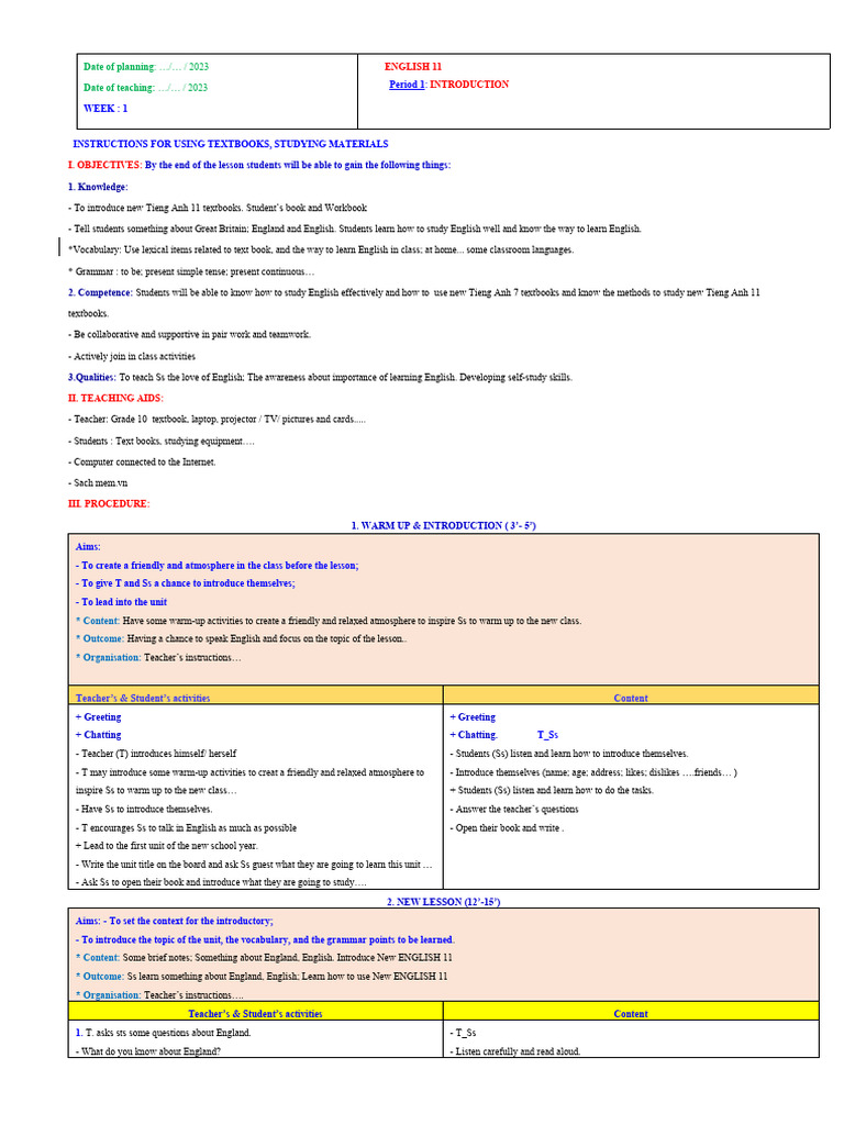 Date of teaching: …/… / 2023 Period 1: INTRODUCTION
