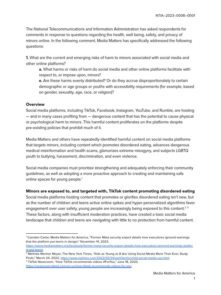 The National Telecommunications and Information Administration has asked respondents forcomments in response to questions regarding the health, well being, safety, and privacy of minors online. In the following comment, Media Matters has specifically addressed the followingquestions: