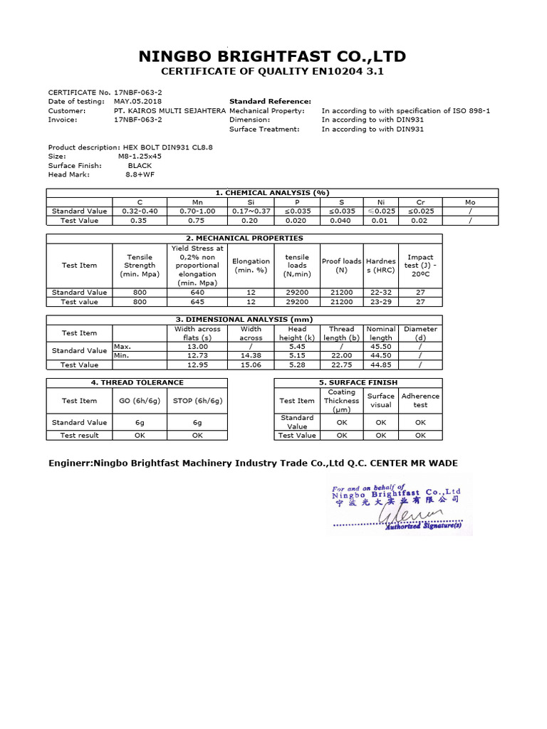 Customer: PT. KAIROS MULTI SEJAHTERA Mechanical Property: In according to with specification of ISO 898-1