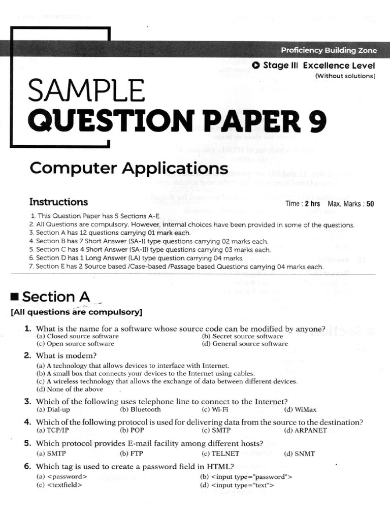 Pre aca ee cot © Stage Ill Excellence Level (Without solutions) SAMPLE QUESTION PAPER 9 Computer Applications Instructions Time: 2 hrs Max. Marks : 50 1. This Question Paper has 5 Sections A-E 2. All Questions are compulsory. However, internal choices have been provided in some of the questions. 3. Section A has 12 questions carrying 01 mark each, 4, Section B has 7 Short Answer (SA-I) type questions carrying 02 marks each 5, Section C has 4 Short Answer (SA-II) type questions carrying 03 marks each 6 Section D has 1 Long Answer (LA) type question carrying 04 marks. 7. Section E has 2 Source based /Case-based /Passage based Questions carrying 04 marks each. mSection A _ [All quest ns are compulsory] 1, What is the name for a software whose source code can be modified by anyone? (a) Closed source softw: (b) Secret source software (c) Open source software (d) General source software 2. What is modem? (a) A technology that allows devices to interface with Internet. (b) A small box that connects your devices to the Internet using cables. (©) A wireless technology that allows the exchange of data between different devices (d) None of the above 3. Which of the following uses telephone line to connect to the Internet? (a) Dial-up (b) Bluetooth (c) Wi-Fi (d) WiMax 4. Which of the following protocol is used for delivering data from the source to the destination? (a) TCP/IP (b) POP (c) SMTP (d) ARPANET 5. Which protocol provides E-mail facility among different hosts? (a) SMTP (b) FTP (c) TELNET (d) SNMT 6. Which tag is used to create a password field in HTML? (a) (b) (@) (b) image gif (c) (d)
