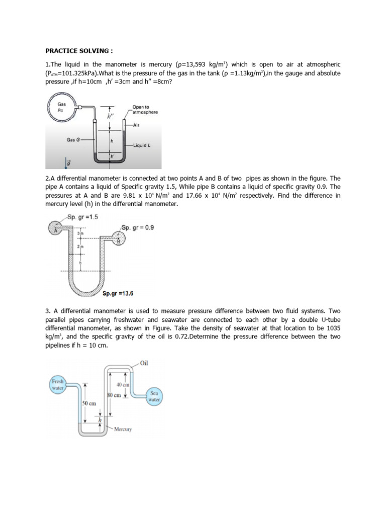 1.The liquid in the manometer is mercury (ρ=13,593 kg/m3) which is open to air at atmospheric