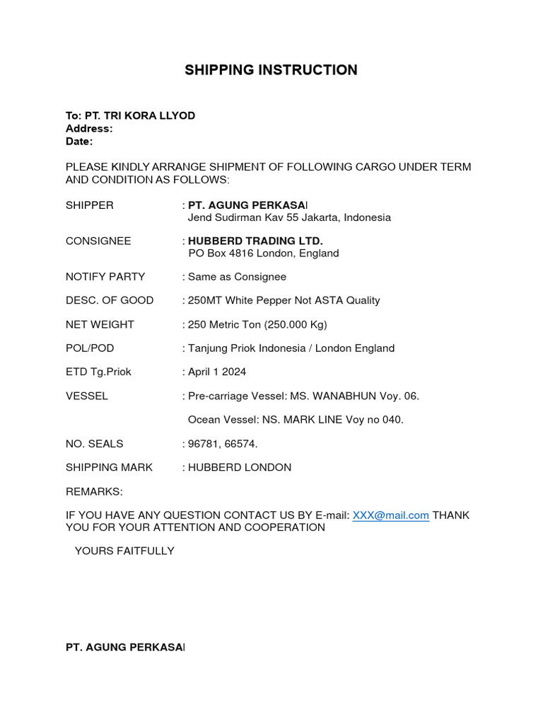 SHIPPING INSTRUCTION