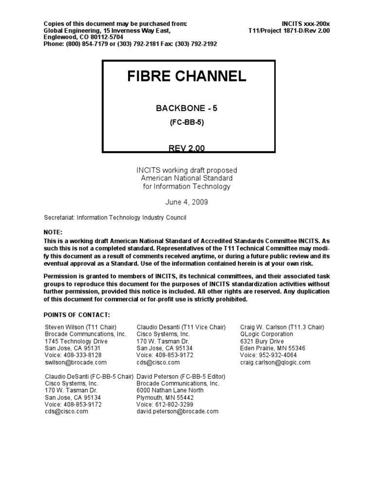 Secretariat: Information Technology Industry Council NOTE: This is a working draft American National Standard of Accredited Standards Committee INCITS. As such this is not a completed standard. Representatives of the T11 Technical Committee may modify this document as a result of comments received anytime, or during a future public review and its eventual approval as a Standard. Use of the information contained herein is at your own risk. Permission is granted to members of INCITS, its technical committees, and their associated task groups to reproduce this document for the purposes of INCITS standardization activities without further permission, provided this notice is included. All other rights are reserved. Any duplication of this document for commercial or for-profit use is strictly prohibited. POINTS OF CONTACT: Steven Wilson (T11 Chair) Brocade Communcations, Inc. 1745 Technology Drive San Jose, CA 95131 Voice: 408-333-8128 swilson@brocade.com Claudio DeSanti (FC-BB-5 Chair) Cisco Systems, Inc. 170 W. Tasman Dr. San Jose, CA 95134 Voice: 408-853-9172 cds@cisco.com Claudio Desanti (T11 Vice Chair) Cisco Systems, Inc. 170 W. Tasman Dr. San Jose, CA 95134 Voice: 408-853-9172 cds@cisco.com David Peterson (FC-BB-5 Editor) Brocade Communications, Inc. 6000 Nathan Lane North Plymouth, MN 55442 Voice: 612-802-3299 david.peterson@brocade.com Craig W. Carlson (T11.3 Chair) QLogic Corporation 6321 Bury Drive Eden Prairie, MN 55346 Voice: 952-932-4064 craig.carlson@qlogic.com