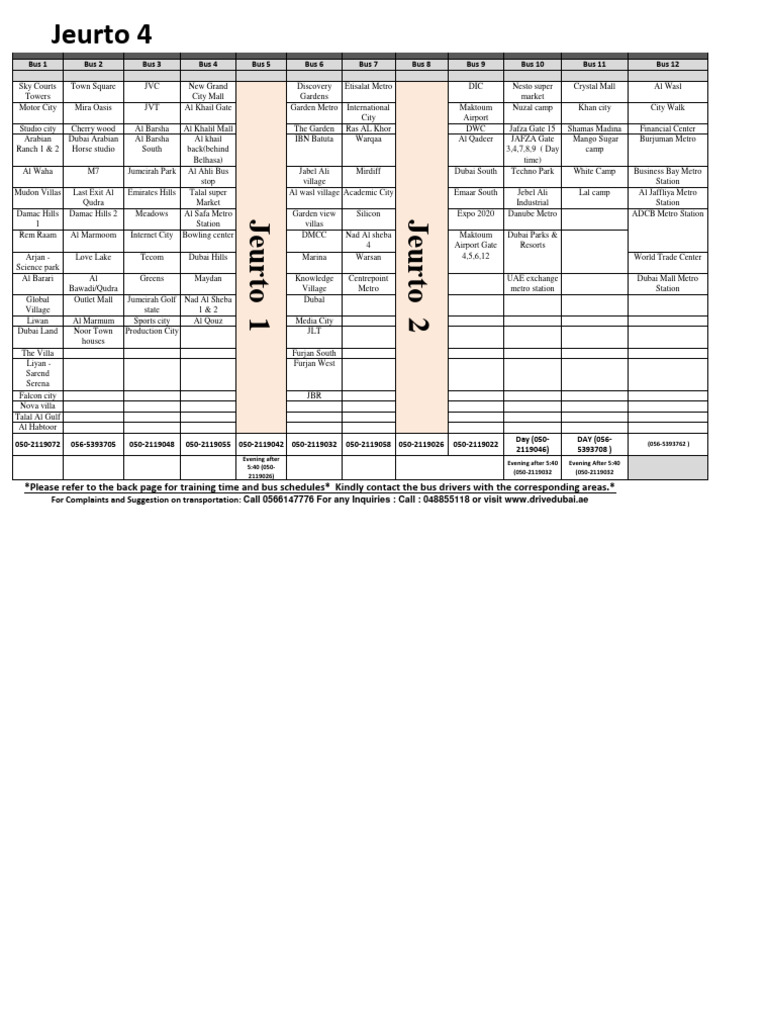 *Please refer to the back page for training time and bus schedules* Kindly contact the bus drivers with the corresponding areas.*