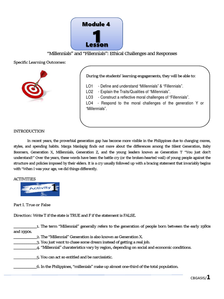 Task 1: (LO4) Respond to the moral challenges of the generation Y or “Millennials”.