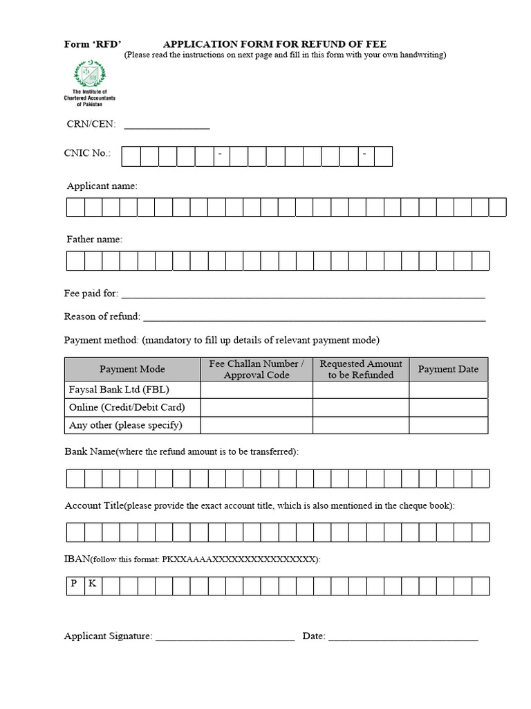 Form ‘RFD’ APPLICATION FORM FOR REFUND OF FEE
