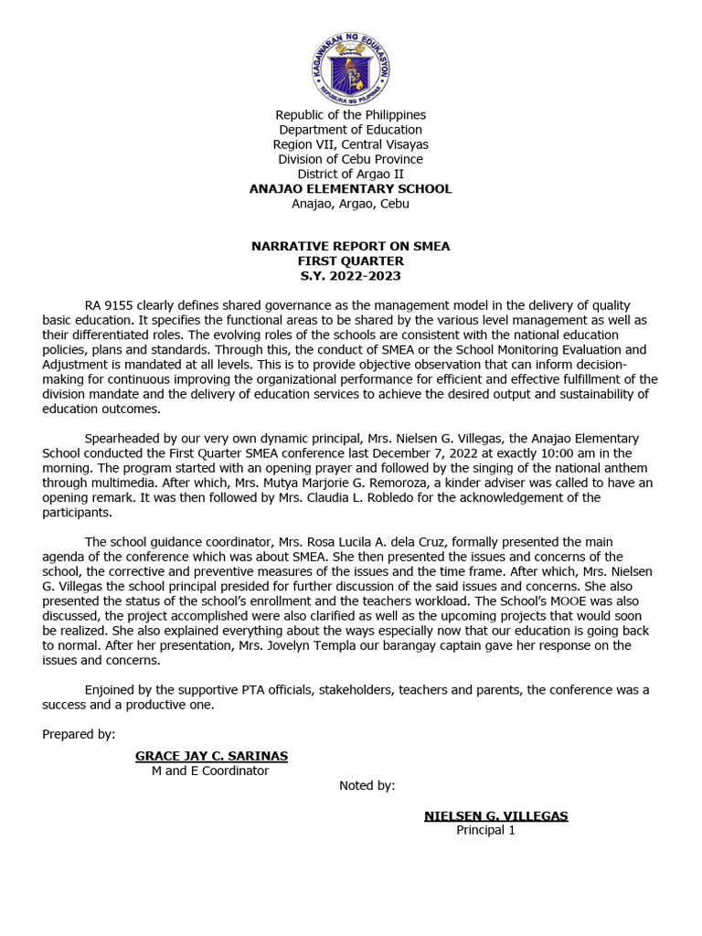 policies, plans and standards. Through this, the conduct of SMEA or the School Monitoring Evaluation and