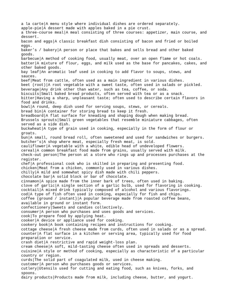 dish|A specific type of food prepared in a particular way.