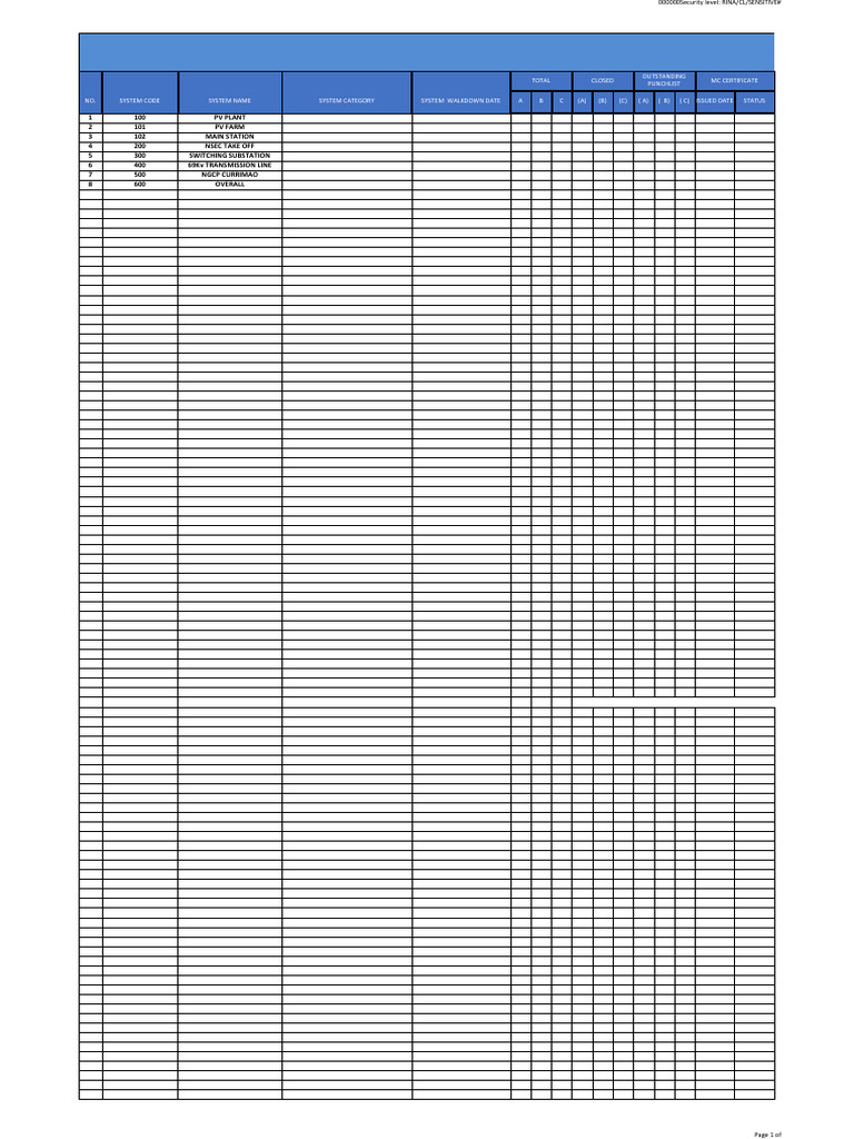 NO. SYSTEM CODE SYSTEM NAME SYSTEM CATEGORY SYSTEM WALKDOWN DATE A B C (A) (B) (C) ( A) ( B) ( C) ISSUED DATE STATUS