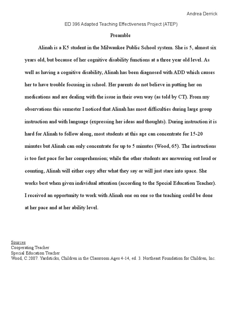 Andrea Derrick ED 396 Adapted Teaching Effectiveness Project (ATEP)