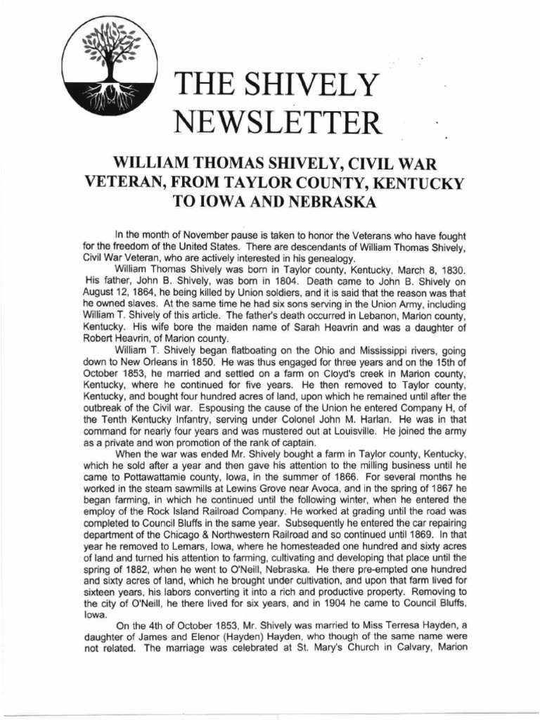 Shively Newsletter the lead article discussed the family of John Shively and Margaret
