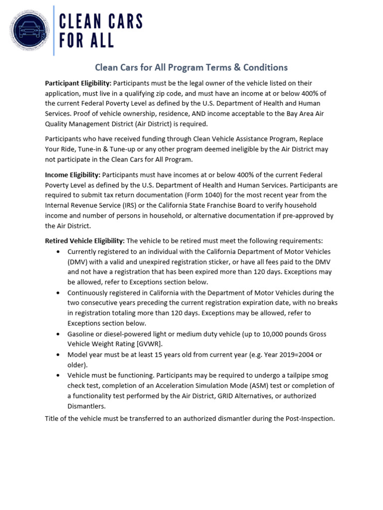 Services. Proof of vehicle ownership, residence, AND income acceptable to the Bay Area Air