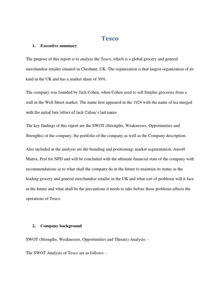 1. Executive summary The purpose of this report is to analyze the Tesco, which is a global grocery and general merchandise retailer situated in Cheshunt, UK. The organization is that largest organization of its kind in the UK and has a market share of 30%. The company was founded by Jack Cohen, when Cohen used to sell Surplus groceries from a stall in the Well Street market. The name first appeared in the 1924 with the name of tea merged with the initial two letters of Jack Cohens last name. The key findings of this report are the SWOT (Strengths, Weaknesses, Opportunities and Strengths) of the company, the portfolio of the company as well as the Company description. Also included in the analysis are the branding and positioning; market segmentation, Ansoff Matrix, Pest for NPD and will be concluded with the ultimate financial state of the company with recommendations as to what shall the company do in the future to maintain its status as the leading grocery and general merchandise retailer in the UK and what sort of problems will it face in the future and what shall be the precautions it needs to take before these problems affects the operations of Tesco.