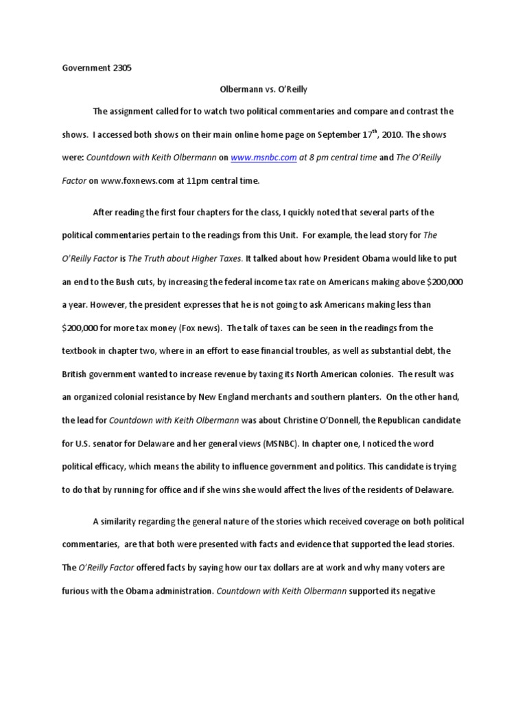 OReilly The assignment called for to watch two political commentaries and compare and contrast the shows. I accessed both shows on their main online home page on September 17th, 2010. The shows were: Countdown with Keith Olbermann on [Link] at 8 pm central time and The OReilly Factor on [Link] at 11pm central time. After reading the first four chapters for the class, I quickly noted that several parts of the political commentaries pertain to the readings from this Unit. For example, the lead story for The OReilly Factor is The Truth about Higher Taxes. It talked about how President Obama would like to put an end to the Bush cuts, by increasing the federal income tax rate on Americans making above $200,000 a year. However, the president expresses that he is not going to ask Americans making less than $200,000 for more tax money (Fox news). The talk of taxes can be seen in the readings from the textbook in chapter two, where in an effort to ease financial troubles, as well as substantial debt, the British government wanted to increase revenue by taxing its North American colonies. The result was an organized colonial resistance by New England merchants and southern planters. On the other hand, the lead for Countdown with Keith Olbermann was about Christine ODonnell, the Republican candidate for U.S. senator for Delaware and her general views (MSNBC). In chapter one, I noticed the word political efficacy, which means the ability to influence government and politics. This candidate is trying to do that by running for office and if she wins she would affect the lives of the residents of Delaware. A similarity regarding the general nature of the stories which received coverage on both political commentaries, are that both were presented with facts and evidence that supported the lead stories. The OReilly Factor offered facts by saying how our tax dollars are at work and why many voters are furious with the Obama administration. Countdown with Keith Olbermann supported its negative