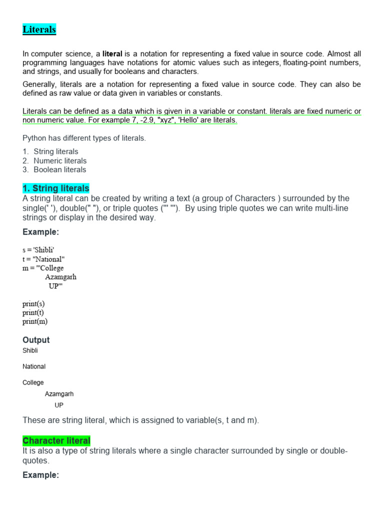 Literals can be defined as a data which is given in a variable or constant. literals are fixed numeric or