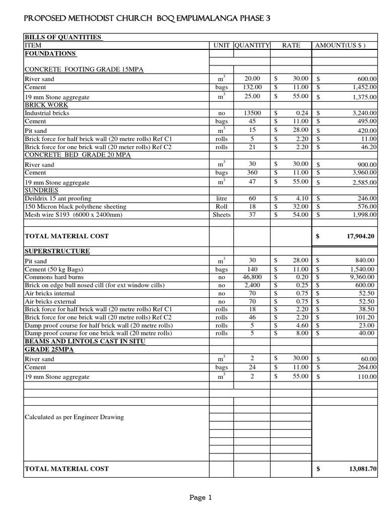 Cement (50 kg Bags) bags 140 $ 11.00 $ 1,540.00