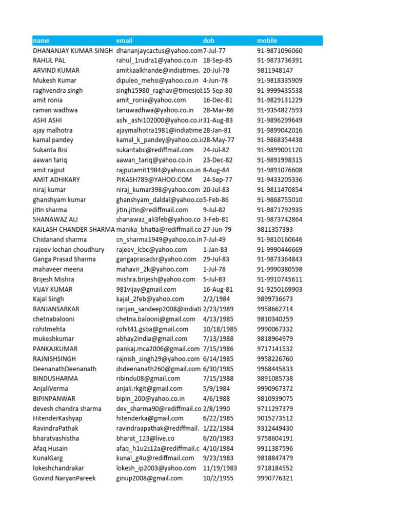 name email dob mobile