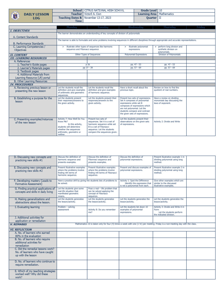V. REMARKS Mathematics 10 is taken only for four (4) times a week with one (1 hr) per meeting. Friday is a non-meeting day with the class.