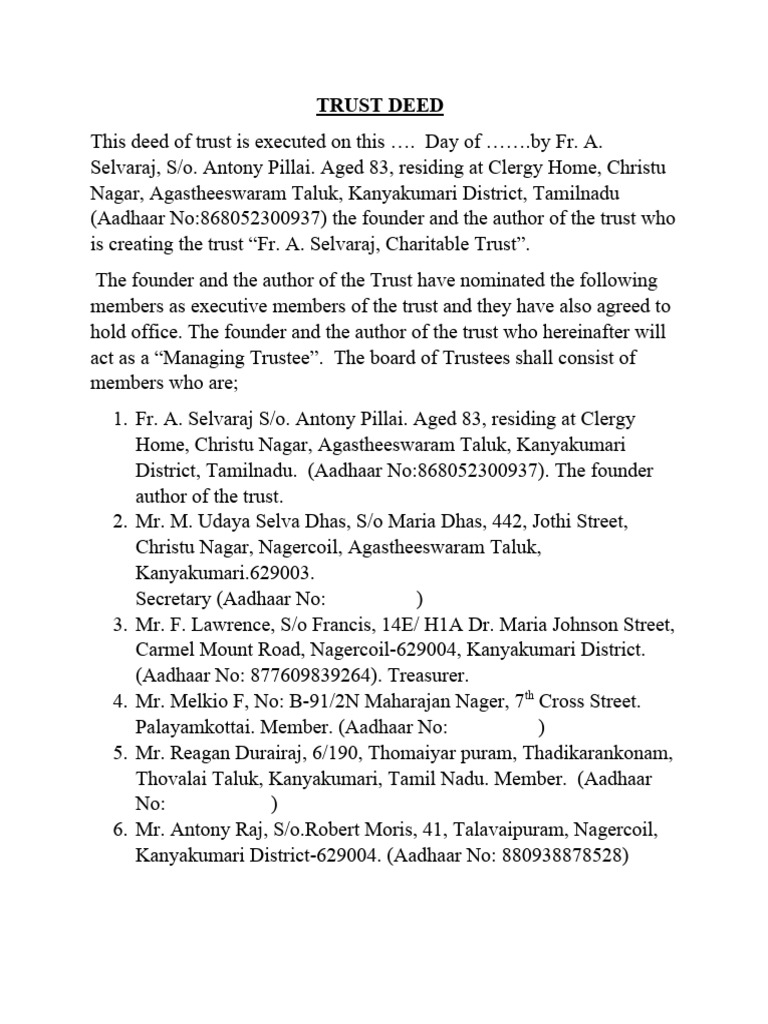 1. Name of the trust: Fr. A. Selvaraj Charitable Trust.