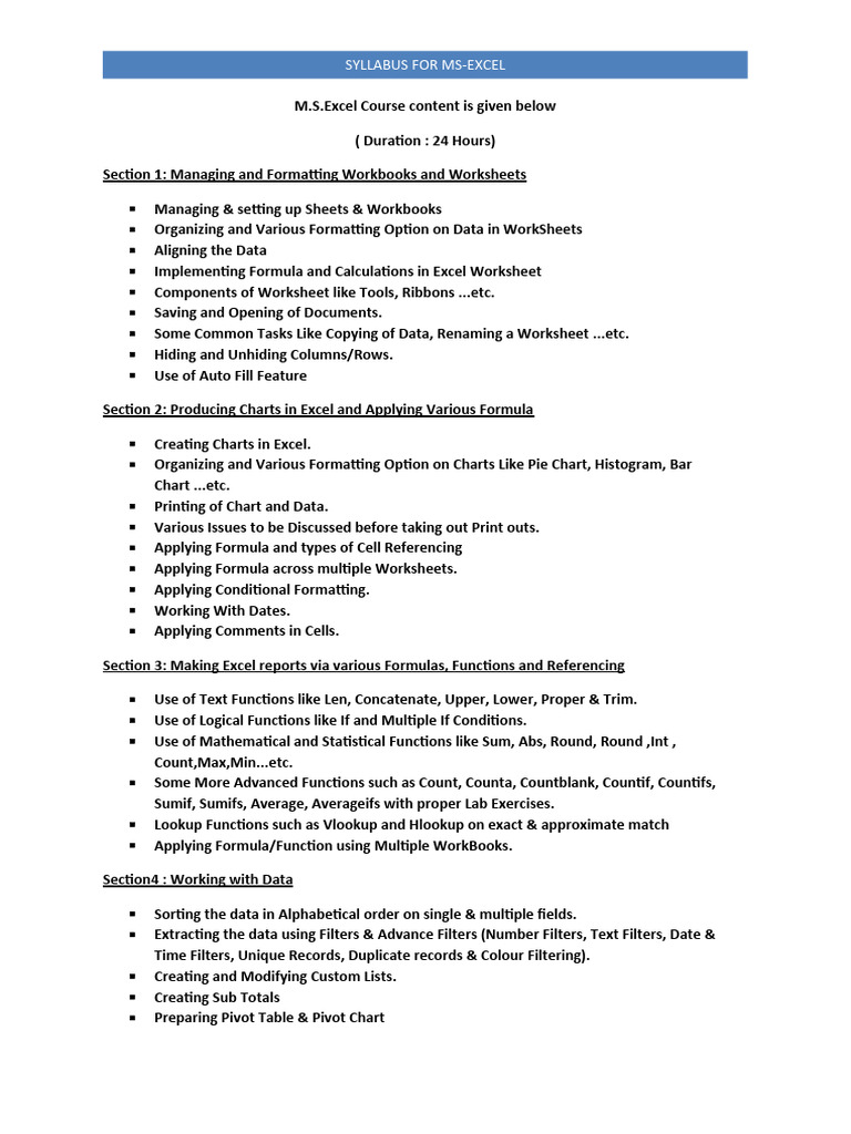 SYLLABUS FOR MS-EXCEL