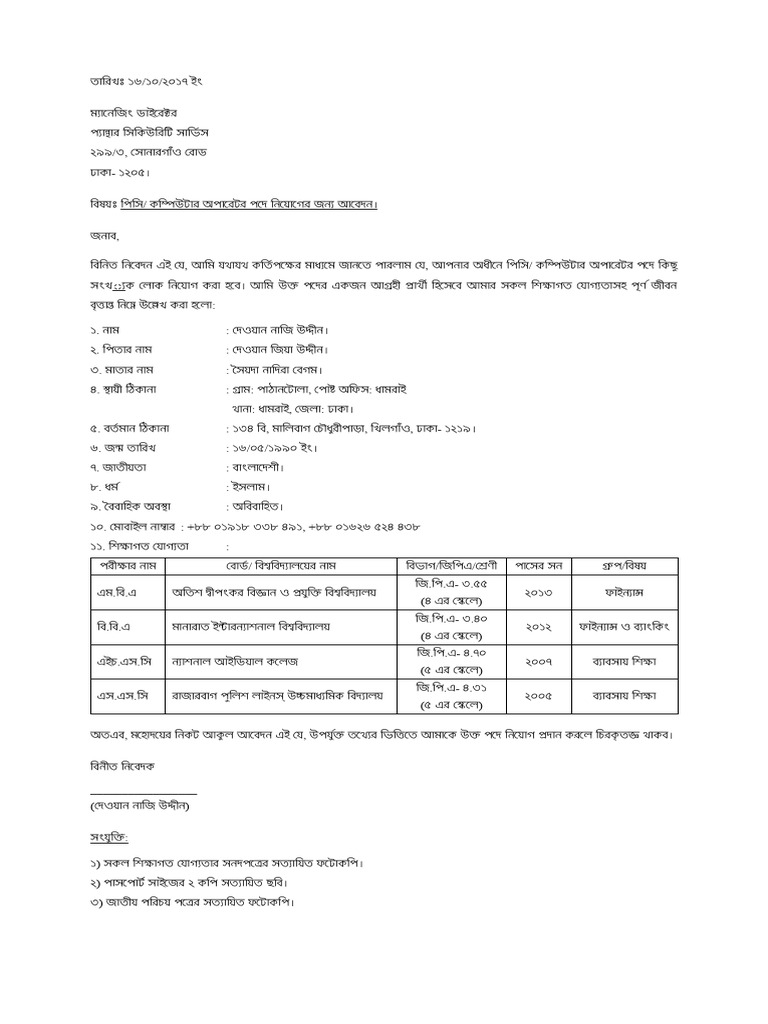সংখ্যক লোক নিয়োগ করা হবে। আমি উক্ত পদের একজন আগ্রহী প্রার্থী হিসেবে আমার সকল শিক্ষাগত যোগ্যতাসহ পূর্ণ জীবন