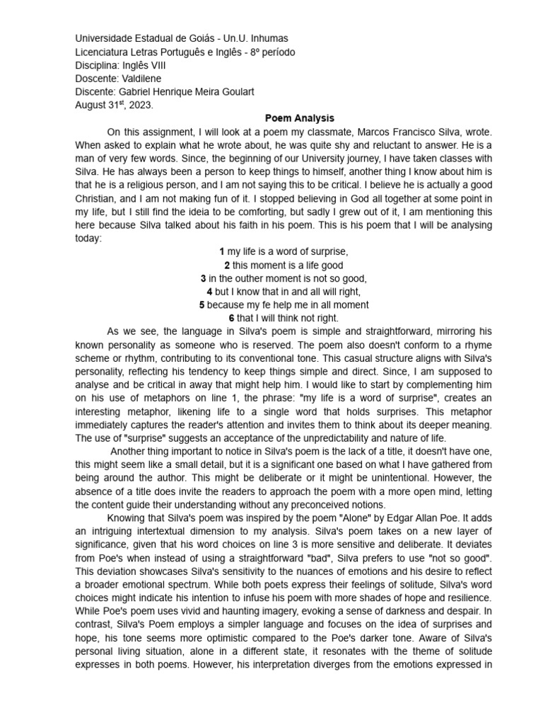 On this assignment, I will look at a poem my classmate, Marcos Francisco Silva, wrote.