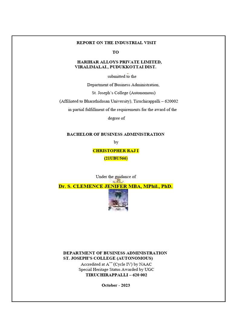 Administration, St. Joseph’s College (Autonomous), Tiruchirappalli, in partial fulfillmentfor