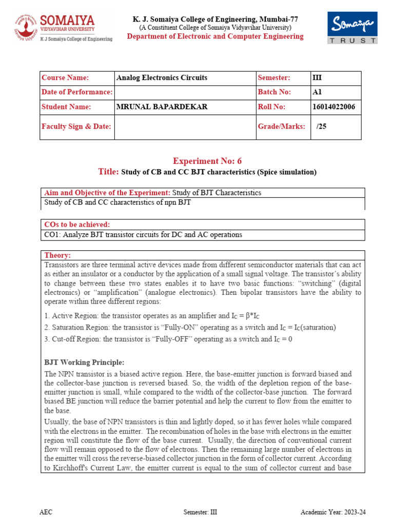 Aim and Objective of the Experiment: Study of BJT Characteristics
