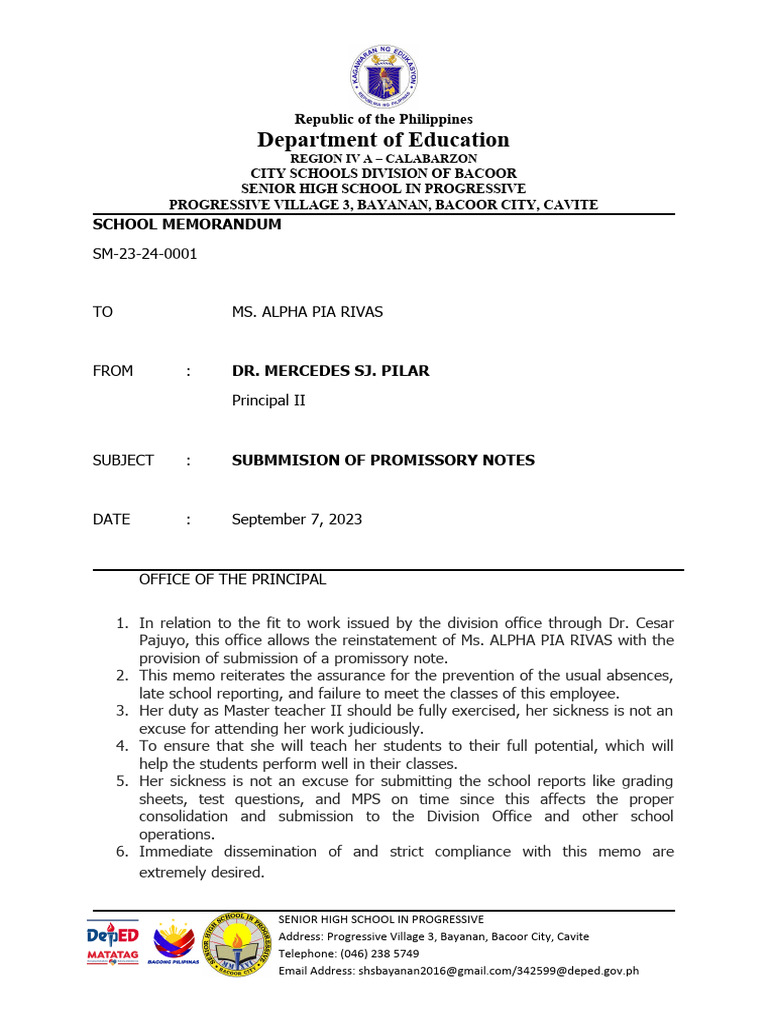 1. In lieu of the school memorandum issued on October 9, 2023, everyone is reminded