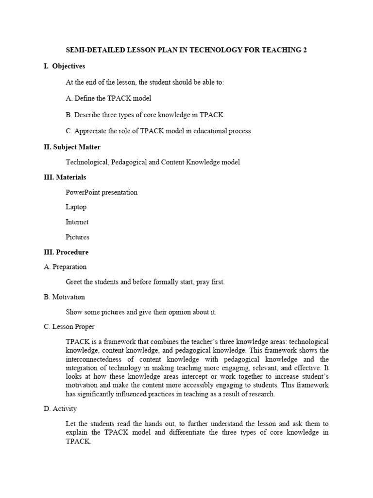 SEMI-DETAILED LESSON PLAN IN TECHNOLOGY FOR TEACHING 2