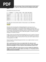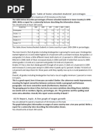 Grades 3-4 has a slow but steady growth througt all six years. It starts at 1.6 percent in 1999 and increases 0.1 every year except in 2003 when it peaks up 0.2 percent. Grades 7-8 starts at 1.6 percent and stays there for three years until it rapidly rises up to 2.2 and peaks at 2.5 in 2004. Overall, all grades including kindergarten has had a rise at rougly minimum 1 percent and more in 6 years. A teachers comment: This is a good report; here is how you can make it better: the coherence needs improvement, meaning the logical connection between sentences inside a paragraph and between paragraphs. Use more connective words (Furthermore, However, etc). The groupings youve done are fine, but try to use more variations describing those statistics: use words such as numbers, figures, percentages, etc. The grammar and the spelling need some extra attention.