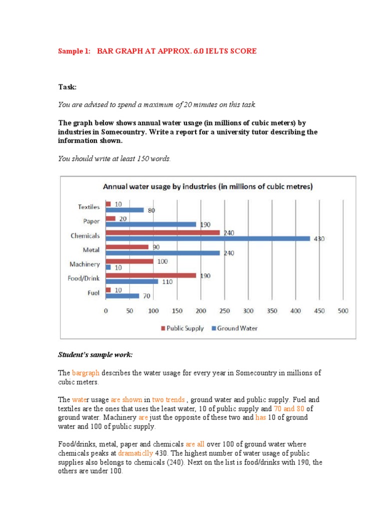 Students sample work: The bargraph describes the water usage for every year in Somecountry in millions of cubic meters. The water usage are shown in two trends , ground water and public supply. Fuel and textiles are the ones that uses the least water, 10 of public supply and 70 and 80 of ground water. Machinery are just the opposite of these two and has 10 of ground water and 100 of public supply. Food/drinks, metal, paper and chemicals are all over 100 of ground water where chemicals peaks at dramaticlly 430. The highest number of water usage of public supplies also belongs to chemicals (240). Next on the list is food/drinks with 190, the others are under 100.