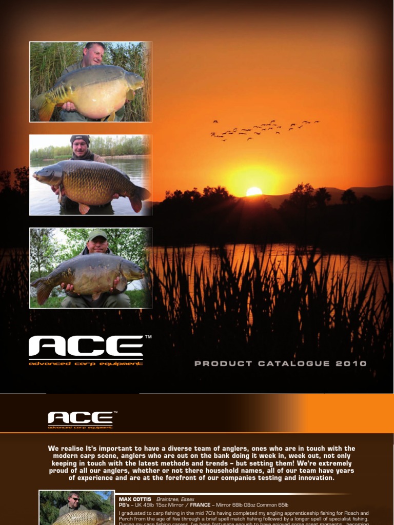 The aim of ACE was simple, to produce a range of tackle, reliable, practical and designed to catch carp not anglers! Unlike many that had gone before, we decided to approach this differently and systematically review all the products that are used on an almost daily basis. Our focus though, was not to look at was good about each of them, I wanted to look at what was wrong then home in and start to put these often small but nonetheless annoying faults right..........for example, how many have us have spent ages trying to thread rig tubing, spend ages forming our shrink tube on a rig only to see it straighten out and useless after just one fish? I could go on, examples of camouflaged hooklink that when you strip back its pretty outer your confronted with a single coloured core, lead clips that dont discard the lead when you have fish go steaming through the weed but dump it off when you cast with a PVA bag...........the list goes on! It was only after months of ongoing development and numerous samples that I realised why so many before had settled with a product that was nearly right rather than sticking with it until they achieved their original objectives. At ACE we are proud to say that we went the extra mile, remaining true to our objectives until we arrived at what we believed to be the best product that was possible. Following more than 18 months extensive testing of ALL of our products, we are proud to say we believe we have produced the best range of terminal tackle available throughout the development, no matter what problems we encountered we never said that will do and I can assure you............we never will! Max Cottis. ACE i-3 ALARM CAMO CORE CAMO LEADCORE CARP LEADERS BAiTiNG TOOLS BAiT DRiLLS RiG TOOLS BOiLiE STOPS SWiVEL AND LiNKS SLEEVES / ShRiNK TUBE RiG TUBES LEAD CLiPS RiG BEADS ROD REST / BACKLEADS MARKER FLOATS CARP LEADS D-SPOOL CARP LiNE 05 10 11 12 16 18 19 20 21 22 23 24 25 26 27 28 29 30