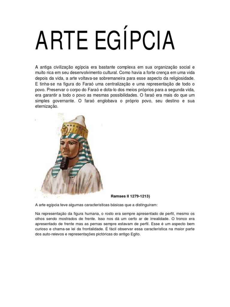 Ramses II 1279-1213) A arte egpcia teve algumas caractersticas bsicas que a distinguiram: Na representao da figura humana, o rosto era sempre apresentado de perfil, mesmo os olhos sendo mostrados de frente. Isso nos d um certo ar de irrealidade. O tronco era apresentado de frente mas as pernas sempre estavam de perfil. Esse um aspecto bem curioso e chama-se lei da frontalidade. fcil observar essa caracterstica na maior parte dos auto-relevos e representaes pictricas do antigo Egito.