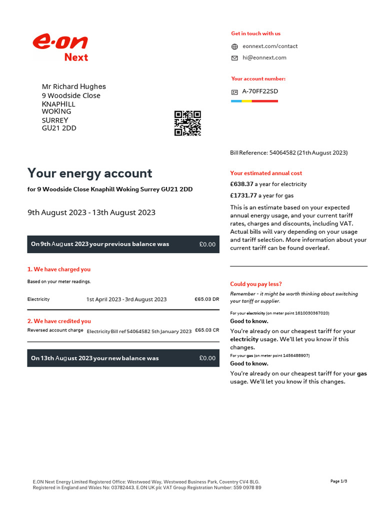 Reversed account charge Electricity Bill ref 54064582 5th January 2023 £65.03 CR You’re already on our cheapest tariff for your