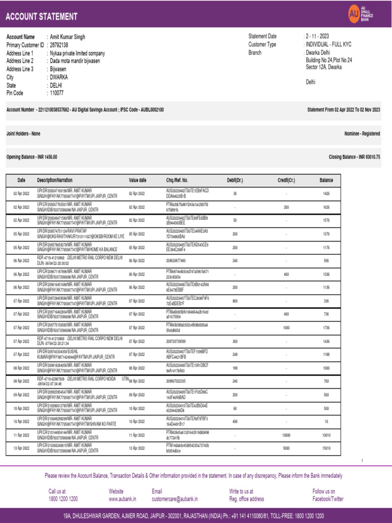 Account Number - 2211210038537682 - AU Digital Savings Account ; IFSC Code - AUBL0002100 Statement From 02 Apr 2022 To 02 Nov 2023