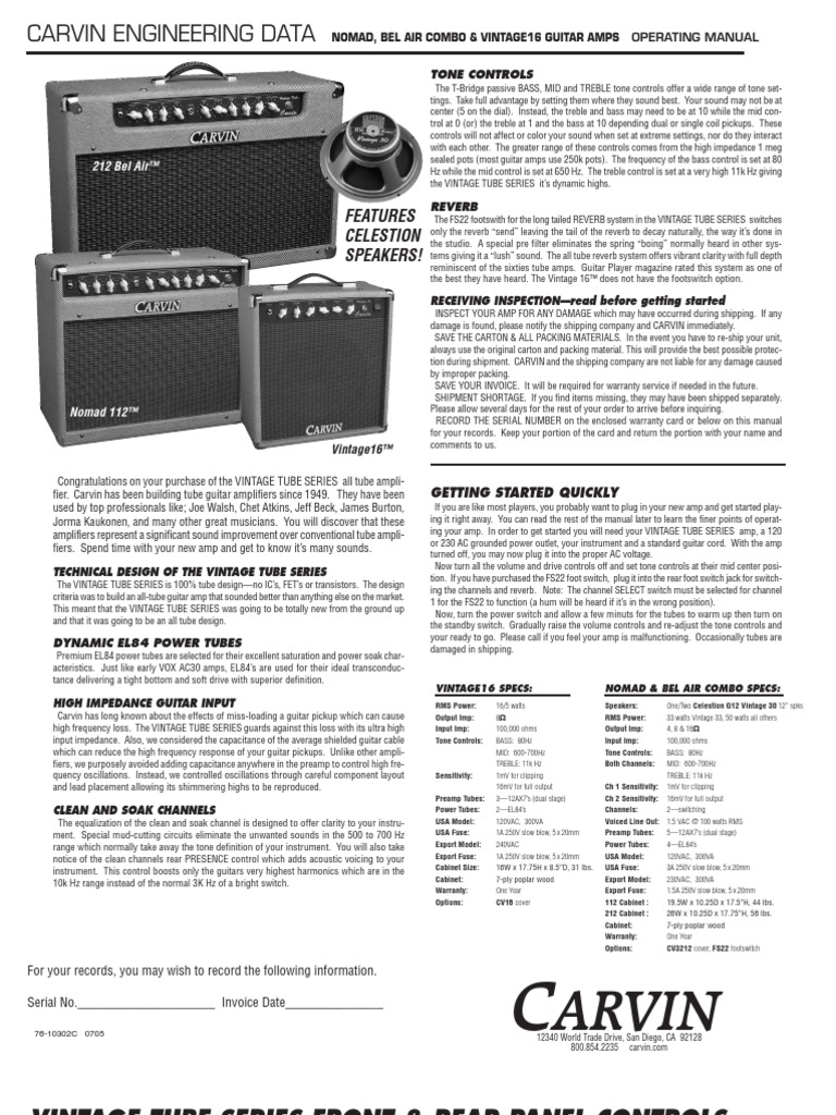 Congratulations on your purchase of the VINTAGE TUBE SERIES all tube amplifier. Carvin has been building tube guitar amplifiers since 1949. They have been used by top professionals like; Joe Walsh, Chet Atkins, Jeff Beck, James Burton, Jorma Kaukonen, and many other great musicians. You will discover that these amplifiers represent a significant sound improvement over conventional tube amplifiers. Spend time with your new amp and get to know its many sounds.