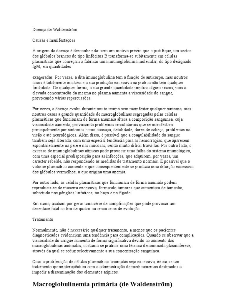 s brancos do tipo linfcitos B transforma-se subitamente em clulas plasmticas que comeam a fabricar uma imunoglobulina molecular, do tipo designado IgM, em quantidades exageradas. Por vezes, a dita imunoglobulina tem a funo de anticorpo, mas noutros casos totalmente inactiva e a sua produo excessiva na prtica no tem qualquer finalidade. De qualquer forma, a sua grande quantidade implica alguns riscos, pois a elevada concentrao da mesma no plasma aumenta a viscosidade do sangue, provocando vrias repercusses. Por vezes, a doena evolui durante muito tempo sem manifestar qualquer sintoma, mas noutros casos a grande quantidade de macroglobulinas segregadas pelas clulas plasmticas que funcionam de forma anmala altera a composio sangunea, cuja viscosidade aumenta, provocando problemas circulatrios que se manifestam principalmente por sintomas como cansao, debilidade, dores de cabea, problemas na viso e at neurolgicos. Alm disso, possvel que a coagulabilidade do sangue tambm seja alterada, com uma especial tendncia para as hemorragias, que aparecem espontaneamente na pele e nas mucosas, sendo muito difcil trav-las. Por outro lado, o excesso de imunoglobulinas atpicas pode provocar uma falha do sistema imunolgico, com uma especial predisposio para as infeces, que adquirem, por vezes, um carcter rebelde, no respondendo s medidas de tratamento normais. possvel que o volume plasmtico aumente e que consequentemente se produza uma diluio excessiva dos glbulos vermelhos, o que origina uma anemia. Por outro lado, as clulas plasmticas que funcionam de forma anmala podem reproduzir-se de maneira excessiva, formando tumores que aumentam de tamanho, sobretudo nos gnglios linfticos, no bao e no fgado. Em suma, acabam por gerar uma srie de complicaes que pode provocar um desenlace fatal ao fim de quatro ou cinco anos de evoluo. Tratamento Normalmente, no necessrio qualquer tratamento, a menos que os pacientes diagnosticados evidenciem uma tendncia para complicaes. Quando se observar que a viscosidade do sangue aumenta de forma significativa devido ao aumento das macroglobulinas anmalas, costuma-se praticar uma tcnica denominada plasmafrese, atravs da qual se reduz selectivamente a sua concentrao sangunea. Caso a proliferao de clulas plasmticas anmalas seja excessiva, inicia-se um tratamento quimioteraputico com a administrao de medicamentos destinados a impedir a disseminao dos elementos atpicos.