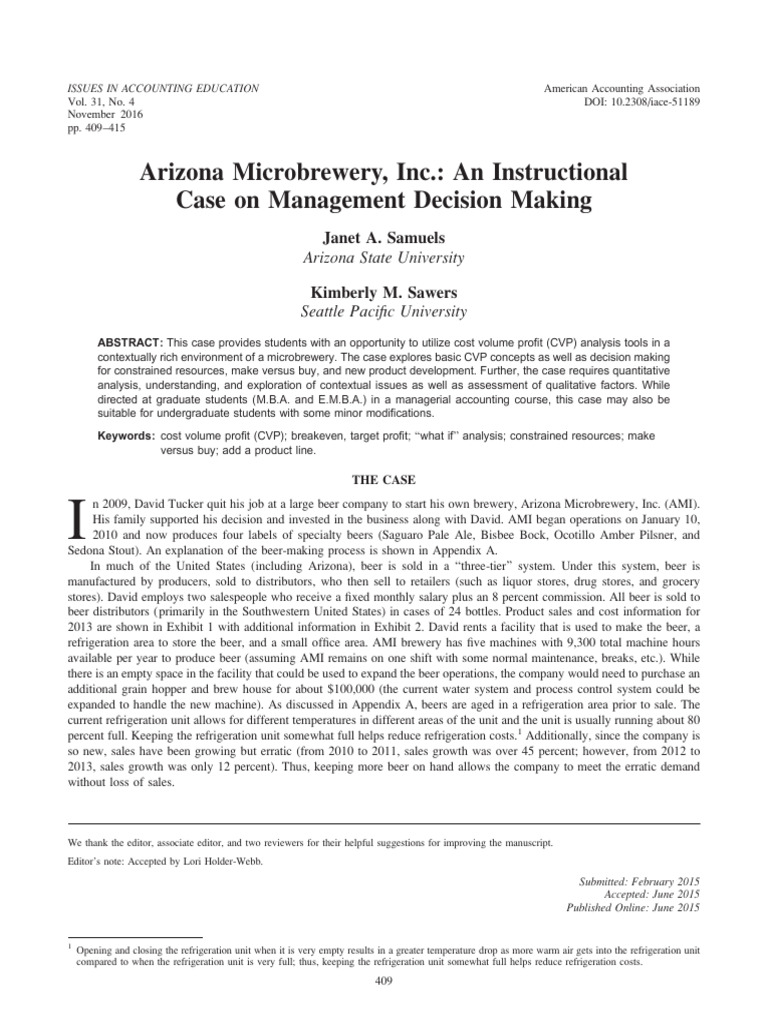 Arizona Microbrewery, Inc.: An Instructional Case on Management Decision Making 411